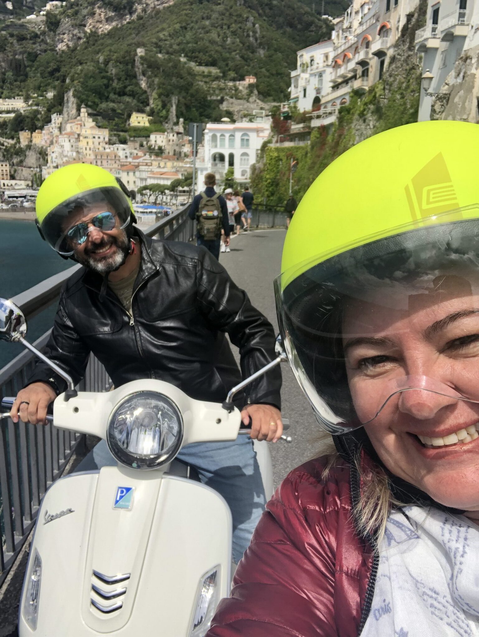 Para conhecer as outras cidades da Costa Amalfitana preferimos fazer de scooter, assim, andando pelas ruas achamos um local que alugava por dia, e poderíamos ficar ate o anoitecer, o que para nos era perfeito… pois não ficaríamos presos a horários, assim alugamos junto a Positano Rent a Scooter.